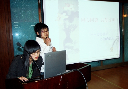 “特色班级”创建活动历时一年,60%以上的班级参与了活动。活动共分初审、终审两个阶段,由评审小组对所有申报班级材料进行筛选,再通过对申报班级的特色主题,特色活动的创新度、班级同学参与度及在同学中受欢迎程度等方面进行考核评审。经过一周公示,文秘0501文明模范班,文秘0504礼仪形象班,文秘0505健康使者班,旅游0502环保精灵班,外旅0502感恩代言者班脱颖而出,成为人文与旅游分院2006年度“特色班级”。