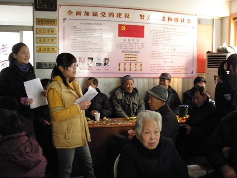 中午,学生党员们买了水果早早来到社区居委会,帮助居委会工作人员准备好他们年终总结大会的椅子、茶水等。在大会过程中,学生党员们认真做好笔记,仔细聆听老党员的工作汇报,学习他们一丝不苟的工作态度和处世经验。而在学生党员自己主持的活动开始后,他们表现积极,气氛活跃,首先在圣诞节之际祝老党员们节日快乐,还集体合唱了《常回家看看》,老党员们都被触动了,跟着哼唱起来。