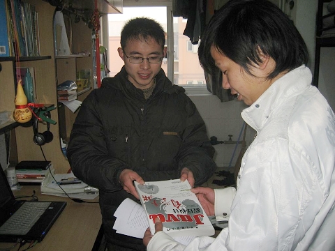 “授人玫瑰,手有余香……帮助学弟学妹们,生命会因此而更富有光彩和意义!……”,机电工程分院学生会助学部的学生干部们正在寝室向即将离校的学长们宣传收助各类课堂参考用书。
