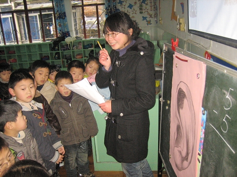 一个小朋友率先取了个纸包递给大学生志愿者念道:“左一片,右一片,隔座山头不见面。小朋友们摸摸看,它是我们身体的哪一个部位?”大学生话音刚落,不少孩子就猜出了答案:“耳朵!”“大家看一看身边的小朋友,他们耳朵上戴的叫什么?”“不知道!”大多数小朋友齐声回答。春春则自告奋勇地说:“我戴的是助听器。”在大学生志愿者的提议下,四五名小朋友争先试戴春春的助听器,并表述自己的感受:“声音太大了!”“好难听啊!”