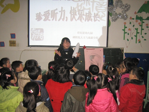 今年年3月3日是第十个全国“爱耳日”。当天,人文与旅游分院的公益服务志愿者走进世纪星幼儿园,开展了内容丰富、形式多样的宣传教育活动,指导小朋友动手用橡皮泥制作多彩的“耳朵”,结合传统的猜灯谜的方式,教育孩子们如何爱护自己的耳朵。