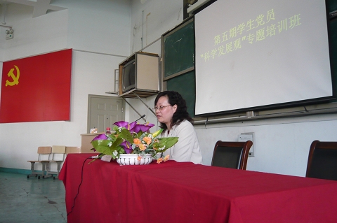 随后,校组织部部长沈建红给全体学员做了专题辅导:“大学生如何学习并实践科学发展观”。沈建红部长从目前学生党员之中自身定位、人生态度和工作方法等几个方面存在的问题出发,指出学习理解科学发展观的内涵和具体要求,在思想上转变错误想法和认识,可以指导大学生富有社会责任感,做一个知识结构完善和人格健全的人。学生党员应该明确自身职责,在教室、在公寓、在校园等公共场所树立健康良好的形象,抓好坚定理想信念、端正学风、发挥学生党支部战斗堡垒作用、发挥带头模范作用四个着力点,通过自学与参加培训相结合,深入认识理解科学发展观,明确学习实践活动的实践特色和目标要求,主动参与各个支部组织的“科学发展‘金点子’征集”活动,为学校破除难题、促转型,进一步深入科学发展献计献策。