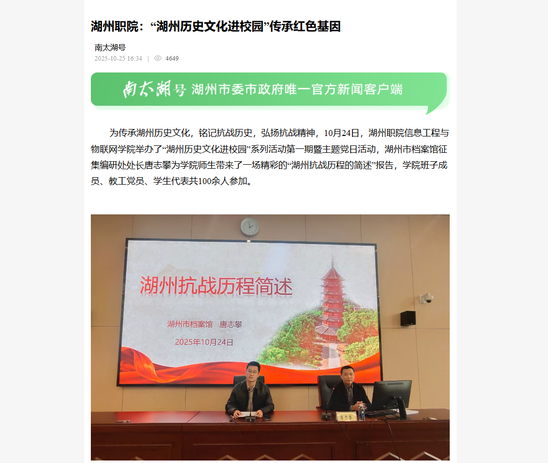 【南太湖号】湖州职院:“湖州历史文化进校园”传承红色基因