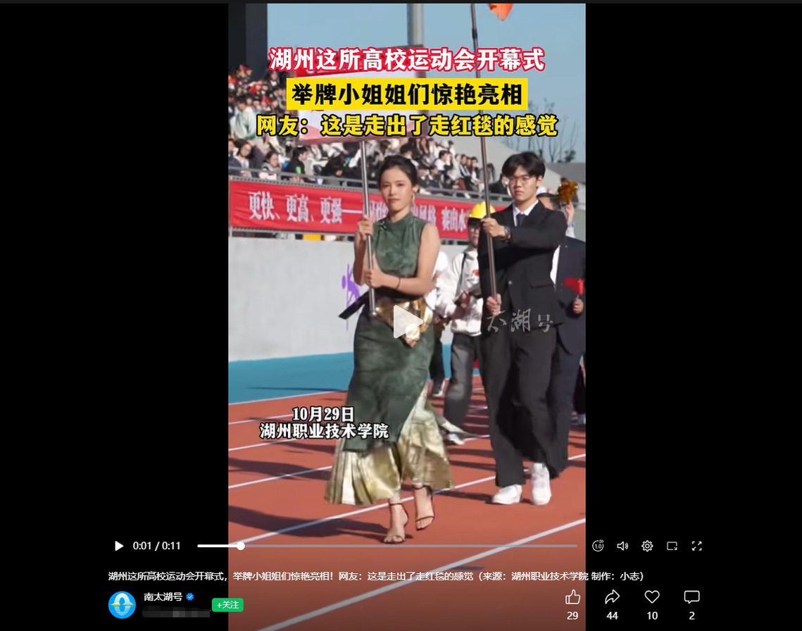 2025年10月30日《南太湖号》报道了我校运动会开幕式,举牌小姐姐们惊艳亮相的相关新闻 请搜索“南太湖号”视频号观看