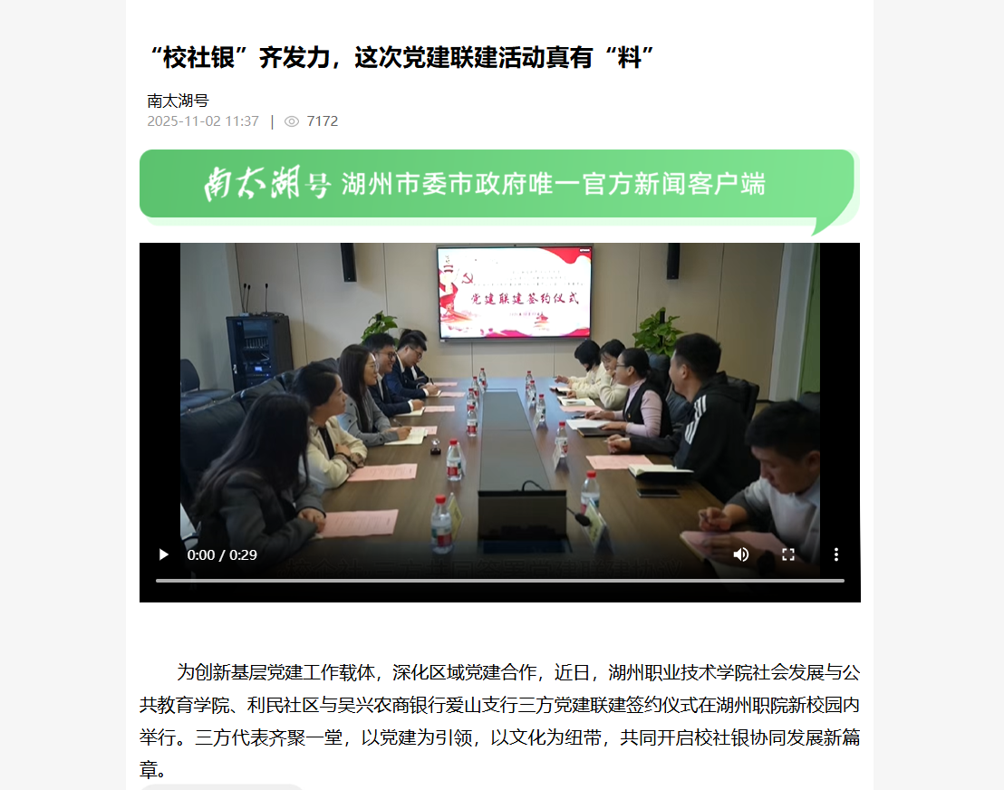 2025年11月2日《南太湖号 》报道学校社会发展与公共教育学院、利民社区与吴兴农商银行爱山支行三方党建联建签约仪式的相关新闻。