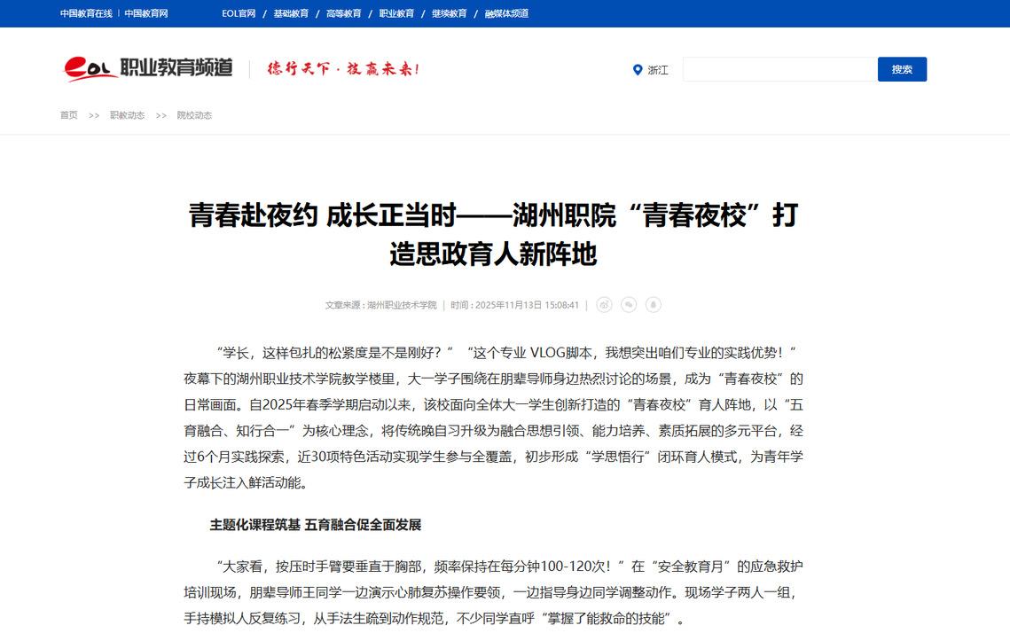 2025年11月13日《中国教育在线》《澎湃新闻》《人民号》《今日头条》《南太湖号》报道学校“青春夜校”打造思政育人新阵地的相关新闻。